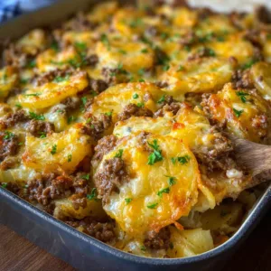 Thin-sliced potatoes bake with seasoned ground beef and a creamy, cheesy sauce until everything melts together into a bubbling, golden pan of comfort. It’s cozy, filling, budget-friendly, and built from ingredients most of us already have in the pantry.