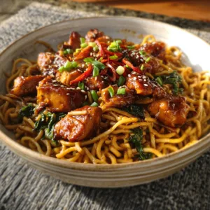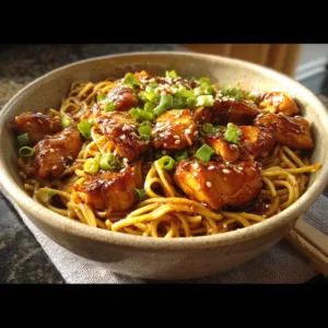 You’ll cook noodles, brown the chicken, whisk together a sticky garlic sauce, and toss everything together until glossy. A touch of honey thickens the sauce, while soy sauce and garlic add deep savory flavor.